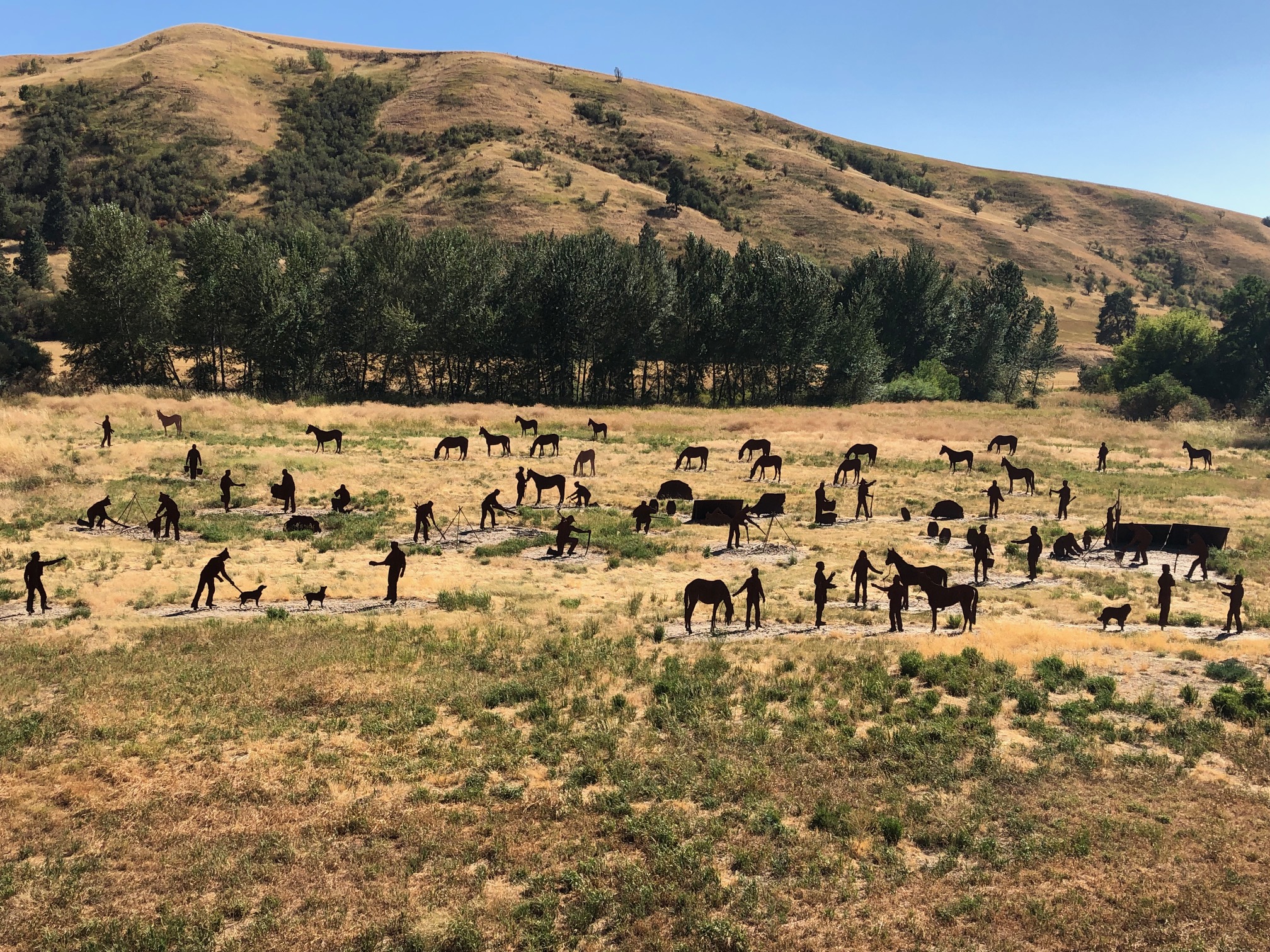 The Corps of Discovery followed an Indian trail that would later become Dayton’s Main Street, to a campsite only 2.5 miles east of Dayton off of today’s Patit Road. The site displays over 80 life-size steel silhouettes of every member of the expedition and even their animals. A bronze legend identifies each person and what task they are engaged in while encamped. Interpretive panels further educate visitors about the site.