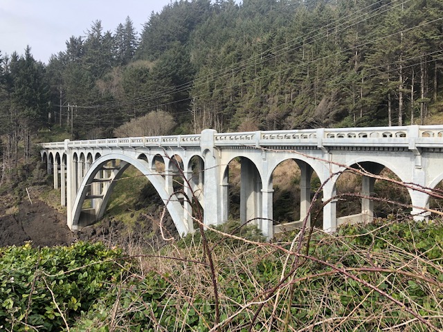 The concrete bridge, built in 1927, originally spanned the creek on what was then part of Hwy 101, before the highway was relocated to create a straighter roadway. This beautiful bridge was designed by engineer Conde B. McCullough, who served as the state bridge engineer from 1919 to 1936 and designed several bridges along the Hwy 101 route. The Rocky Creek Bridge is on the National Register of Historic Places.